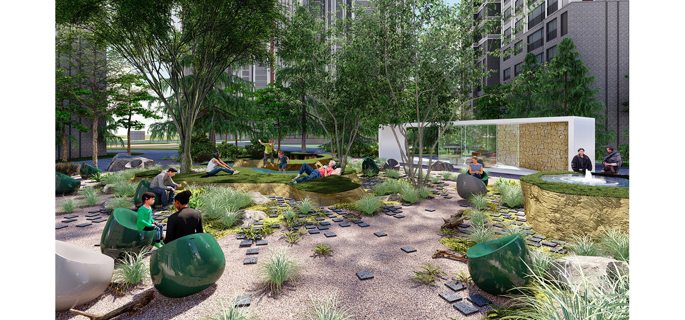 가장 날 것의 정원, 가장 원초적인 정원, 가장 투박한 정원을 그린다. 돌, 땅, 흙, 바위, 풀, 원형그대로의 것들이 새롭게 들어오고 재편성되는 공간이다. 새로운 도시민의 문화와 취향, 연대와 공유, 멋과 유희가 거칠지만 치밀한 자연의 세팅위에 향유되는 정원이다. 규정되지 않은 공간의 쓰임새를 통해 자유로운 이용자공간을 구성한다. 놀이, 휴식, 문화행위의 새로운 풍경을 자아내는 야생과 도시의 적절한 조합이 눈에 띈다. 시그니처가든으로 출발한 프로젝트는 그린바이그루브라는 자연풍과 도시풍의 새로운 정원언어를 생성하고 새로운 주거공간의 모델정원을 제시한다.